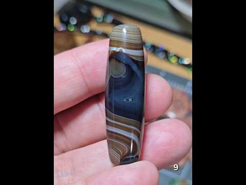 These striking banded agate cylinder beads showcase flowing layers of deep charcoal, warm brown, and smoky honey tones, deep slate-blue, and navy creating natural striations that feel both dramatic and grounding. The high polish enhances the stone’s silky banding and subtle translucency, giving each bead a rich sense of depth and organic movement. Drilled and ready for design, these statement beads are perfect as bold focal elements for artisan jewelry, sculptural necklaces, or one-of-a-kind creations that call for earthy elegance and timeless character.