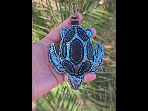 Midnight Drift pairs black leather with striking metallic turquoise-veined leather panels, finished with bold contrast stitching for a cool, luminous edge. Individually cut from hide and hand-stitched from my original pattern, this dimensional leather turtle bag charm is built to endure.